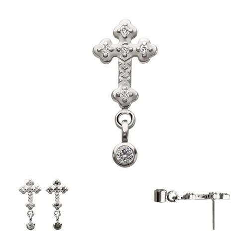 Titanium Threadless Milgrain Edge Prong Set CZ Gem Cross Top with Dangle Bezel Gem