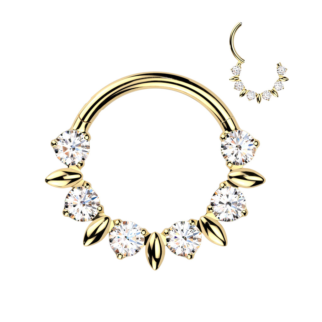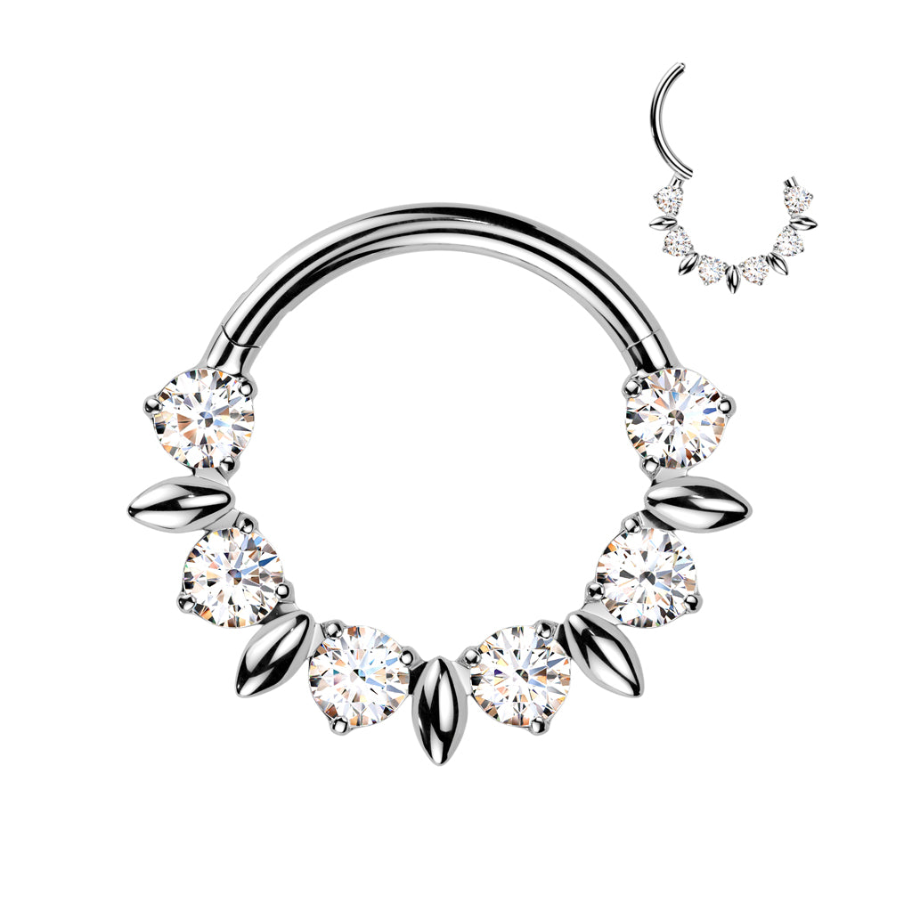- Implant Grade Titanium Hinged Segment Hoop Ring With Forward Facing CZ And Leaves In Between
